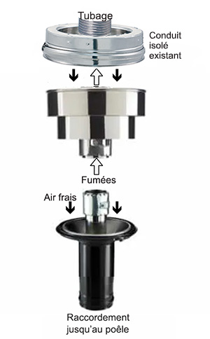 C'est Laurent, le technicien de Solution Poêle qui nous a soufllé l'idée de cette technique : Il s'agit de raccorder le poêle à granulés jusqu'au conduit existant avec un conduit concentrique type PGI de Poujoulat. Le conduit intérieur de ce conduit concentrique sera connecté au tubage qui sera inséré dans le conduit existant. Et le 2e conduit du conduit concentrique ira chercher l'air frais dans l'espace libre entre le tubage et l'ancien conduit. Cela nécessitera une sortie de toit spécifique puisqu'elle devra laisser entrer de l'air dans l'espace vide du conduit.