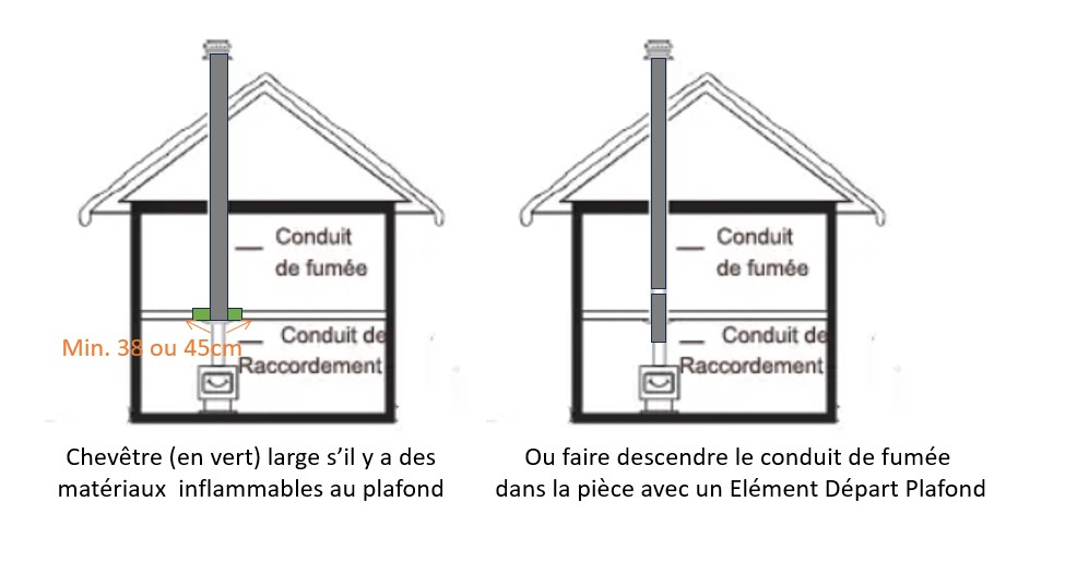 - Si le problème vient des matériaux du plafond, faîtes un chevêtre plus large si c'est possible sinon faîtes descendre le conduit de fumée isolé dans la pièce. S'il descend de 38 cm dans la pièce, les distances de sécurité devraient être respectées même avec un poêle à bois (avec les angles mais c'est un peu compliqué à expliquer).