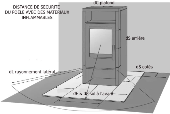 Attention, les distances s'appliquent tout autour du poêle (derrère bien sur mais aussi sur les côtés et devant). Elles sont souvent plus grandes devant le poêle à cause du rayonnement.