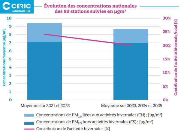 - les concentrations liées aux activités hivernales (incluant le chauffage au bois) ont, quant à elles, reculé de près de 23 % sur la même période.