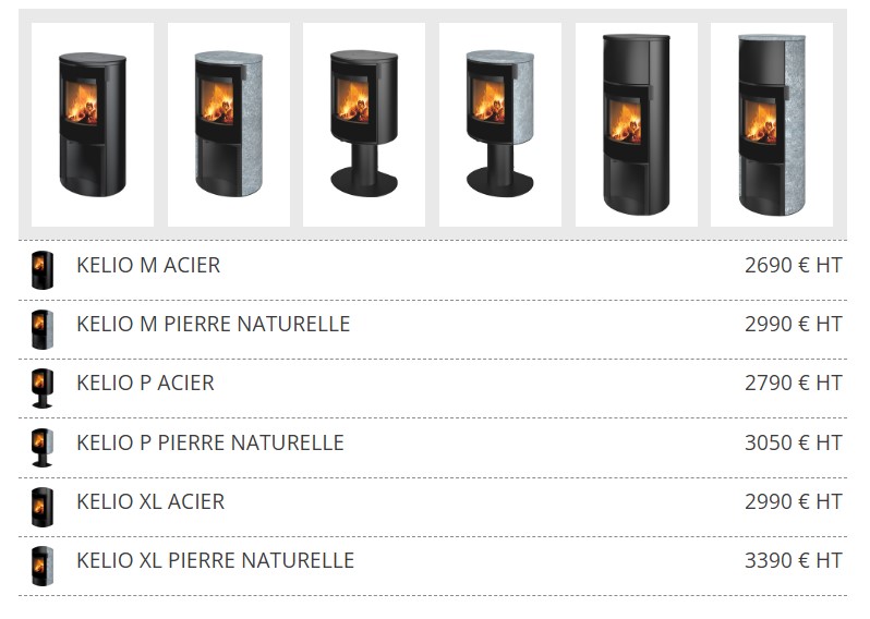 Kelio est en fait une gamme complète de poêles à bois, basée sur une même chambre de combustion, correspondant au cœur de la demande. On y trouve :