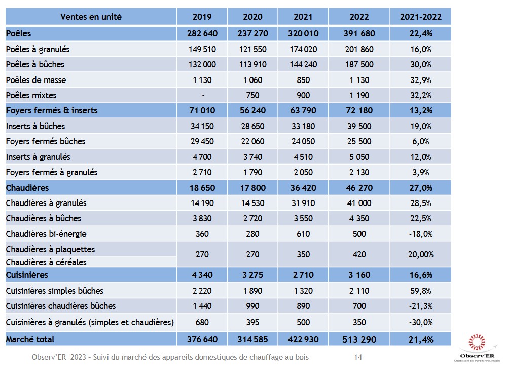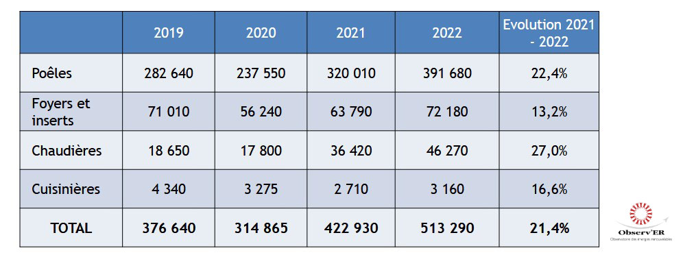 L’étude dénombre 392 000 poêles commercialisés soit 76% des ventes totales avec une répartition quasi similaire entre les poêles bois et les poêles granulés. Et on peut supposer que le surcroit de ventes de poêles granulés en début d’année 2022 a été compensé par le retournement du marché en faveur du bois buches en cours d'année.