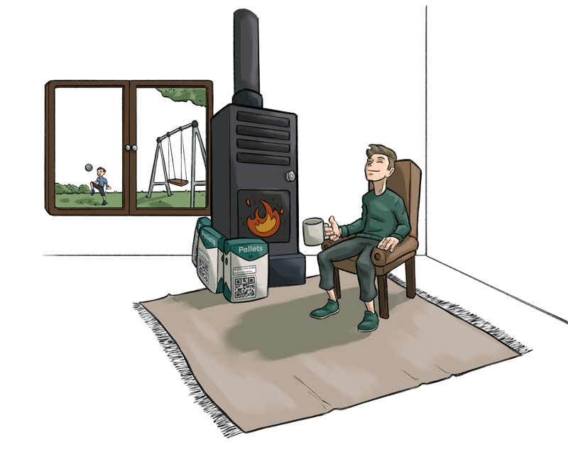 Jeremy a donc eu l'idée d'équiper les fabricants de granulés avec des appareils utilisés en laboratoire et de prendre des mesures toutes les 8h. Les résultats de ces mesures sont rattachés à des QR code imprimés sur les sacs de granulés lors de l'ensachage. Le particulier flashe ce QR Code avec son téléphone et une application lui calcule les bons réglages optimisant son modèle de poêle au lot de granulé qu'il a acheté en fonction des mesures que N2air a préalablement effectué dans son laboratoire sur ce modèle d’appareil.