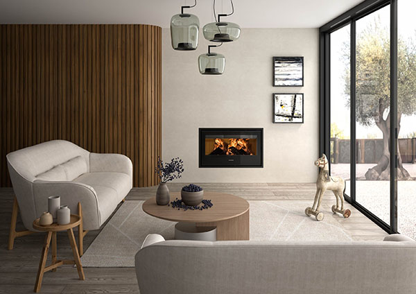 Pour faciliter l'installation, les cassettes sont équipées de poignées latérales. La charnière de la porte est réversible. Le revêtement en béton réfractaire blanc, la vitre panoramique bordée d'un noir sobre et le cadre de porte étroit avec poignée escamotable, soulignent l'aspect minimaliste mettant en lumière les flammes. Des ventilateurs particulièrement silencieux (2 ventilateurs pour le 70 cm et 4 ventilateurs pour 100 cm de large) diffusent la chaleur rapidement et uniformément.